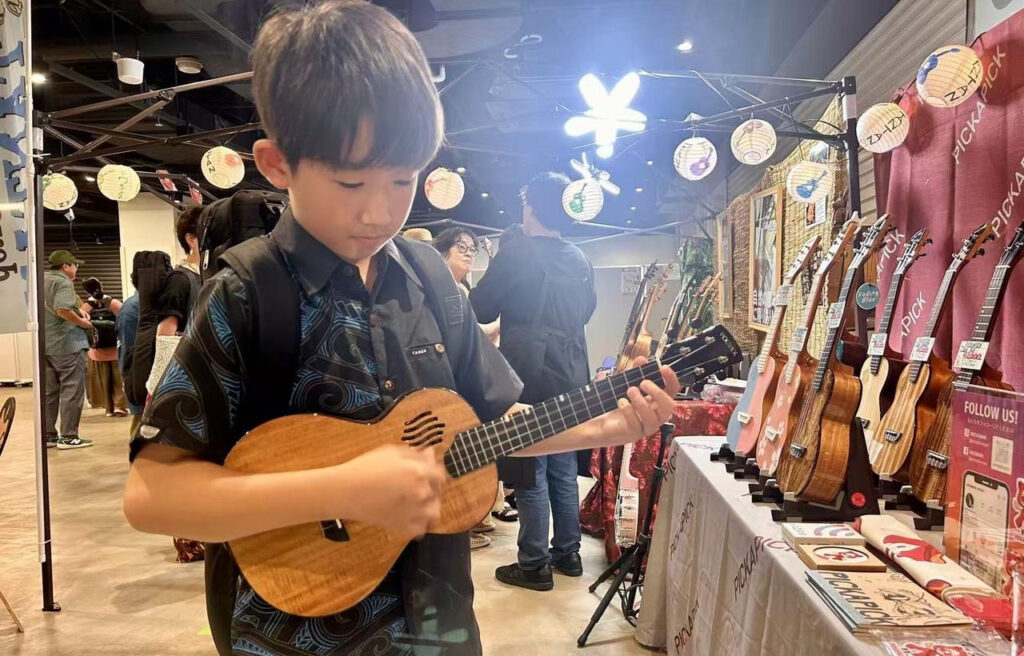 PICKAPICK’s exhibition area was a “starry spot,” with many renowned artists from Japan’s ukulele scene stopping by to experience the brand’s instruments. Ebak, known for rock-style ukulele playing, performed dynamic pieces on a PICKAPICK ukulele, fully demonstrating the versatility of the instrument; popular and talented player KYAS also visited the area to experience the design and sound characteristics of the Stage Series up close; promising young players Kazuma and kaishin drew a large crowd of young fans with their energetic performances; cajón player rakkyo also attended to interact, sharing a relaxed and joyful musical atmosphere with on-site fans. In addition, PICKAPICK’s long-time friend, Holoholo Cafe, showed support, adding more warmth to the exhibition area.